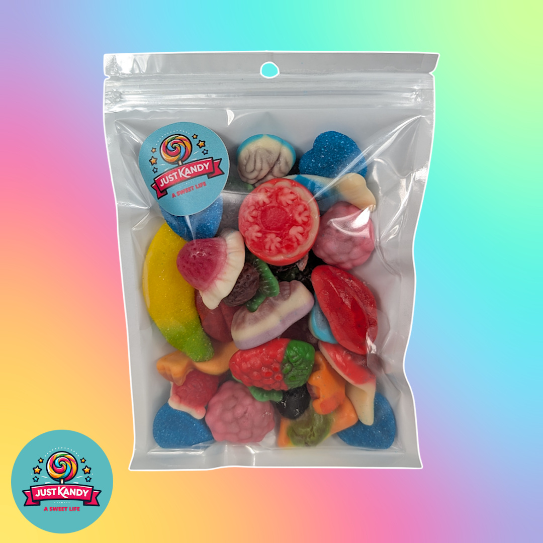 A chewy mix of up to 15 jelly-filled sweets, from bananas and hearts to wild strawberries — soft, squishy, and bursting with fruity flavour